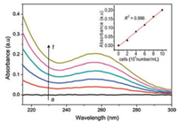 | Fig. 2. UV-vis spectrum of suspension of different concentrations of Hela cell. The inset is the relationship between adsorption intensity at 260 nm and concentration of cells. The concentration of cells from a to f: 0×105, 2×105, 4×105, 6×105, 8×105, 10×105 cells/mL respectively. | |