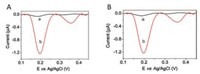 | Fig. 4. Square wave voltammetry curves: (A) reaction of 0.9% NaCl solution with molybdate (curve a), reaction of dead cell supernatant with molybdate (curve b); (B) reaction of living cell supernatant with molybdate (curve a) and reaction of dead cell supernatant with molybdate (curve b). | |