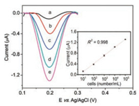 | Fig. 5. Square wave voltammetry curves for detection of different concentrations of cells. The inset is the calibration plot. The concentration of cells from a to e: 101, 102, 103, 104, 105 cells/mL. | |