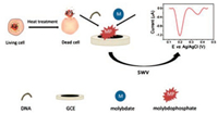 Cell death can be divided into two ways, cell necrosis and apoptosis [18-21]. Cell necrosis is a passive death caused by environmental factors, such as physical or chemical factors. Cell apoptosis is an active death process of cell controlled by genes. Both ways can break the cytoplasmic membrane, which causes the release of DNA molecules. Here, we studied an electrochemical assay for measuring the concentration of cells. Heat treatment was used to kill the cells, and then the supernatant of cells that containing the released DNA was collected by centrifugation and reacted with sodium molybdate solution under acidic conditions. The concentration of the cells was determined by measuring the current intensity. Because the cytoplasmic membrane of living cells is intact, there is no DNA released, therefore, the viability of the cells can also be determined by this method. This electro-chemical assay is simple, time efficient and has the advantages of high sensitivity, which can be widely used in various scientific research fields such as disease diagnosis and drug screening. The detailed experimental procedures are shown in Supporting information.