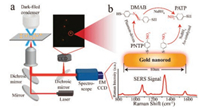 | Fig. 1. Schematic overview of the DFSERS. (a) Experimental set-up used to obtain Raman spectra and located a single AuNR. (b) Schematic of monitoring catalytic reaction of the PNTP dimerizing into DMAB and reduced to PATP on a single AuNR by SERS. | |