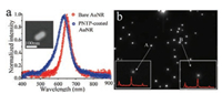 | Fig. 2. (a) Dark-field scattering spectra of a single AuNR before and after functioned with PNTP, the inset is the scanning electron microscope image of a single AuNR. (b) The grayscale of the single gold AuNR acquired using the EMCCD. The symbol A and B are the represent of the AuNR with the SERS active and the insets are the corresponding SERS spot stimulated by the laser and the corresponding SERS spectra under 785 nm laser. | |