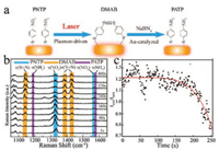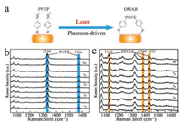 | Fig. 3. (a) Schematic illustration of the coupled plasmon-driven reaction of PNTP dimerizing into DMAB on a single AuNR. (b and c) The SERS spectra under continuous 785 nm laser excitation with the laser power of (b) 20 mW and (c) 40 mW. | |