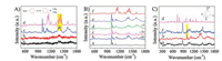 | Fig. 2. (A) Raman spectrum of (a) 10 μmol/L MO and (d) MO solid, SERS spectrum of 10 μmol/L MO on the β-CD-SH functionalized (c) or not (b) Ag NP monolayer film. (B) SERS spectrum of (a-e) MO with the concentrations of 0, 5 × 10-7, 5 × 10-6, 10-6 and 10-5 mol/L, respectively on the β-CD-SH functionalized Ag NP monolayer film, (f) solid MO. (C) SERS spectrum of (a) 10 μmol/L 1-AT on the Ag NP monolayer film, (b, c) 10 μmol/L MO on the β-CD-SH functionalized Ag NP monolayer film with the presence of 1-AT (c) or not (b), (d) Raman spectrum of 1-AT solid. | |