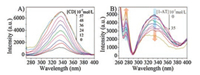 As is generally accepted, the inclusion of MO into β-CD cavity will give rise to a prominent fluorescence at about 335 nm due to the fluorescence sensitization effect. Accordingly, the fluorescence spectra of MO in the presence of β-CD at different concentrations were measured to consolidate the above result, as shown in Fig. 3A. Although there was a weak fluorescence prior to the addition of β-CD, which may be attributed to the background and the aggregation-induced fluorescence enhancement, it still can be easily found that the fluorescence of MO increases significantly by the addition of β-CD (until 48 mL of 10-2 mol/L β-CD) within a short period (< 40 min) and reaches a plateau at last. Relatively, after the introduction of the competitive binder 1-AT whose fluorescence appeared at around 275 nm, the fluorescence of MO gradually decreased upon increasing the addition content of 1-AT while the fluorescence of 1-AT was correspondingly enhanced (Fig. 3B). Namely, when 1-AT was competitively included into the β-CD cavity, the release of MO from the β-CD cavity resulted in a significant decrease in fluorescence due to the elimination of the fluorescence sensitization effect between MO and β-CD. It should be a solid evidence for the inclusion of MO into β-CD.