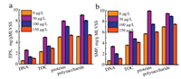 | Fig. 2. EPS (a) and SMP (b) characterized by DNA, TOC, protein and polysaccharide in the MBR at different SMZ influent concentrations. The values are average of 30 sample values. | |