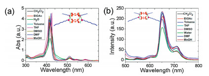 | Fig. 3. (a) UV–vis absorption spectra of 4 in different solvents. (b) Fluorescence emission 4 in different solvents. | |
