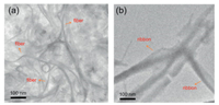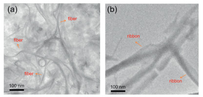 | Fig. 6. (a) TEM image of 4 self-assembly into nanofibers. (b) TEM image of 4 selfassembly into nanoribbons. | |
