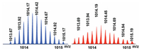 | Fig. 2. Calculated (blue) and experimental (red) ESI-TOF-MS spectra of metallacage 4 [M-8OTf]8+. | |