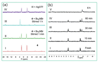 | Fig. 5. (a) 31P{1H} NMR spectra (room temperature, 121.4 MHz, water/CH3CN) of adding Bu4NBr into the solution of 4 with different time: (Ⅰ) pure 4; (Ⅱ) 1 min; (Ⅲ) 1 h; (Ⅳ) AgOTf and the solution of (Ⅲ). (b) 31P{1H} NMR spectra (room temperature, 121.4 MHz, water) of adding HOTf into the solution of 4 with different time: (Ⅰ) fresh prepared; (Ⅱ) 10 min; (Ⅲ) 30 min; (Ⅳ) 60 min; (Ⅴ) 6 h. | |
