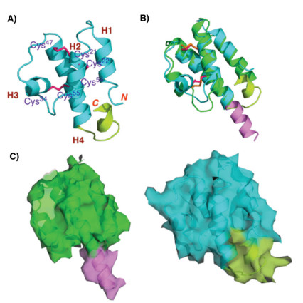 | Fig. 3. A cartoon representation of the structure of rC5a-desArg (green), with three pairs of disulfide bond (orange). | |