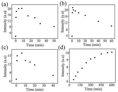 | Fig. 2. Oxidation time dependent fluorescence intensity for dihydroxyindoles oligomers. A plot of the fluorescent intensity value at excitation wavelength 359 nm versus the oxidation time for P-DHICA (a); at excitation wavelength 360 nm for PDHICMe (b); at excitation wavelength 340 nm for P-DHICEt (c); at excitation wavelength 365 nm for P-DHI (d). | |