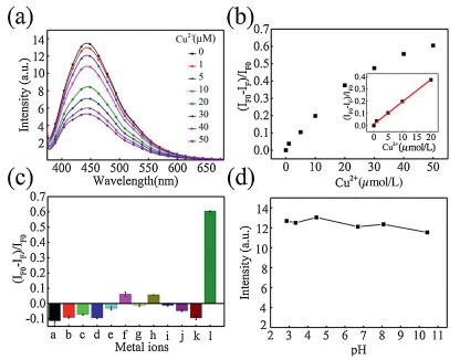 | Fig. 3. (a) The change of P-DHICA fluorescence spectra with the increase of Cu2+ concentration; (b) A plot of the (IF0-IF)/IF0 value versus the concentration of Cu2+; the inserted figure is the linear fit from 0 to 20 μmol/L, R > 0.998; (c) The corresponding histogram of (IF0-IF)/IF0 value at 359 nm vs. metal ions (a to m: Li+, Na+, K+, Mg2+, Ca2+, Co2+, Cr3+, Fe3+, Mn2+, Sr2+, Zn2+ and Cu2+); (d) Effect of pH value on P-DHI florescence intensity. | |