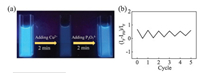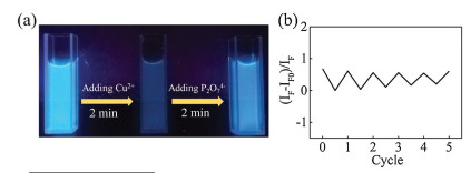 | Fig. 4. (a) Reversible switching of P-DHICA between the ON and OFF states through the alternate addition of Cu2+ and pyrophosphate; (b) The photograph of P-DHICA solution before and after adding Cu2+ and P2O74- under 365 nm light. | |