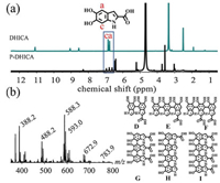 | Fig. 1. (a) 1H NMR spectra of DHICA (in DMSO-d6) and P-DHICA (in D2O); (b) The ESI-MS spectrum and possible chemical structures of P-DHICA. | |