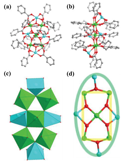 | Fig. 1. (a) and (b) Ball-and-stick representation of the molecular structure of 1 viewed along two different orientations. (c) The polyhedral mode of heterometallic Ti5Cu4 core structure. (d) The connection between Ti and Cu atoms. Hydrogen atoms are omitted for clarity. Cu: cyan, Ti: green, O: red, C: grey. | |