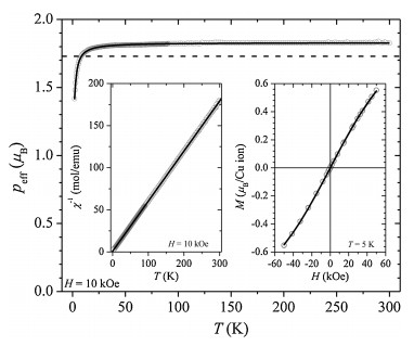 | Fig. 3. The temperature dependence of peff per CuⅡ ion. The dashed line represents the spin-only theoretical value and the full line the fit with the PHI software. The left inset shows χ-1 as a function of temperature and the fit with the Curie-Weiss model (black line). The right inset shows the M(H) curve with the black curve representing the fit with the Brillouin function. | |