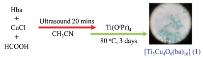 As shown in Scheme 1, the solvothermal reaction of Ti(OiPr)4 with Hba and CuCl in the presence of 5 μL of HCOOH in CH3CN at 80 ℃ for 3 days gave green crystals of Ti5Cu4O6(ba)16 (1), with the yield of about 65% based on Ti(OiPr)4. Thermal gravity analysis (TGA, Fig. S2 in Supporting information) demonstrates that this cluster can be stable up to about 300 ℃. The slight weight loss before can be ascribed to the removal of the solvent molecules. The total mass loss of about 70% up to 800 ℃ results from the decomposition of the outer organic ligands.