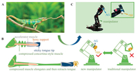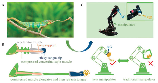 | Fig. 1. Chameleon tongue inspired design of a soft-contact grasping manipulator empowered by adhesives. (A) Chameleon preys on an insect by its adhesive tongue. (B) Schematic view of the chameleon tongue with a mucilage-functionalized tip (dark blue), and a manipulator empowered by an adhesive gel (AG, dark blue) that can grasp an egg. A traditional manipulator is supposed to damage the fragile egg. (C) A photo of an AG-empowered manipulator capable of capturing a chicken egg (inset). The AG was stained in dark blue for highlight. | |