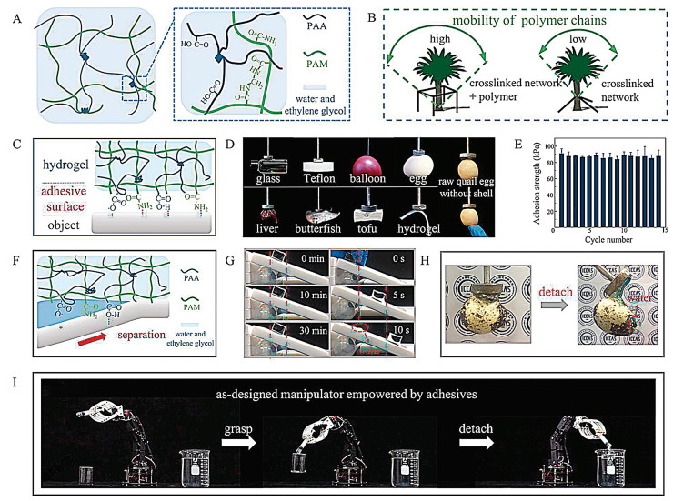 | Fig. 2. The design and performance of AGs for a grasping manipulator. (A) AGs were designed by restricting adhesive PAA chains (blue lines) in the supporting PAM network (green lines). (B) Schematic illustration of polymer chain mobility in AG (left) and P(AM-co-AA) (right) system. (C) Schematic illustration of electrostatic interactions and hydrogen bonding between AG functional groups (e.g., amino, carboxyl and carboxylic acid groups) and the objective surface. (D) Photos showing the AG-empowered manipulator can grasp diverse objects with different surface properties, shapes and sizes. Two photos on the right side: a shell-less quail egg displayed obvious deformation but without damage by gentle touching. (E) Recovery test of AG showing no substantial decrease in adhesion strength after 15 cycles. Error bars represent standard deviation; sample size n = 6. (F) The infiltration of water competed with the AG-substrate bonding, which facilitated the detachment of AGs. (G) The AGs can adhere to the Teflon surface for more than 30 min (left), but immediately slipping down a wet surface (right). (H) Water-assisted detachment of quail egg from AG without any detectable damages. Water was stained in blue for highlight. (I) Photos of a designed soft-contact grasping manipulator empowered by adhesives can grasp, move and detach a beaker. | |