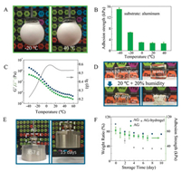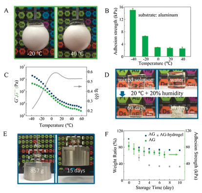 | Fig. 3. Temperature tolerance and long-term stability of the AGs. (A) Photos of AG-empowered manipulator grasping eggs at -20 ℃ and 40 ℃. (B) The shear adhesion strength of AG on aluminum plate under -40~40 ℃ illustrating the thermal tolerant of AG to maintain adhesion in a wide temperature window. Error bars show standard deviation; sample size n = 6. (C) Temperature-dependent dynamic rheology of the AG on a temperature sweep in the range of -40~60 ℃ at a constant shear strain (γ) of 0.1% and frequency (ω) of 1 rad/s. (D) Photos of AG (on the 1st day and 60th day) and the AG-hydrogel (on the 1st day and 30th day) exposed to air (25 ℃, 20% humidity). (E) The AG can lift an 857 g object after exposure to air for 15 days (25 ℃, 20% humidity). (F) Weight ratio and adhesion strength of AG and AG-hydrogel after different exposure time (25 ℃, 20% humidity) indicating the long-term stability of AG. Error bars show standard deviation; sample size n = 6. | |