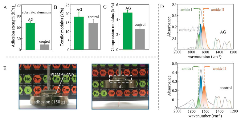 | Fig. 4. Enhancement of AG mechanical properties and cohesion strength with addition of PAA. (A) Adhesion strength, (B) tensile and (C) compression modules of AG (with PAA) and control (without PAA). Error bars show standard deviation; sample size n = 4 for modulus calculate and sample size n = 6 for adhesion strength. (D) ATR-FTIR spectra of AG (with PAA, top) and control (without PAA, bottom). (E) Photos of PDMA/PAA which can sustain a 150 g iron block. | |
