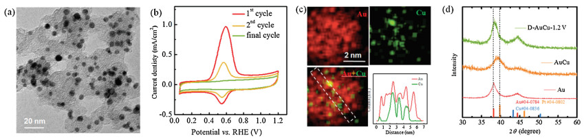 | Fig. 1. (a) TEM image of the as-prepared AuCu NPs supported on Vulcan XC carbon support. (b) CV curves (the 1st, 2nd and last cycle) of electrochemical dealloying of AuCu NPs by 200 cycles between 0.05 V and 1.2 V at 500 mV/s in N2-saturated HClO4 solution. (c) EDX mapping and line profile of D-AuCu NPs, evidencing a AuCu alloy and an Au shell.(d) XRD patterns of pristine AuCu NPs, D-AuCu NPs, and pure Au NPs. | |