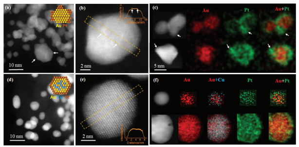 | Fig. 2. HAADF-STEM images, EDX-mapping and structural model of D-AuCu@Pt (a–c) and Au@Pt (d–f) nanoparticles. | |