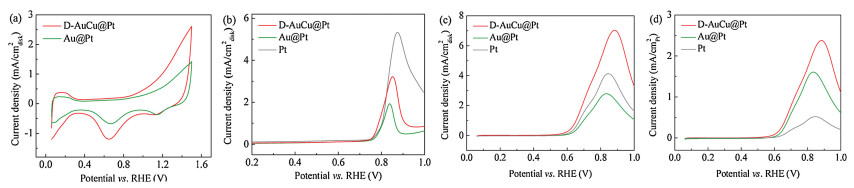 | Fig. 3. Electrochemical characterization and methanol oxidation activities of D-AuCu@Pt and Au@Pt catalyst in comparison with a commercial Pt/C (Johnson Matthey 3000, 2 nm) electrocatalyst. (a) CVs in N2-saturated 0.1 mol/L HClO4 solution at 100 mV/s. (b) CO stripping in 0.1 mol/L HClO4 at 10 mV/s. (c) MOR polarization curves recorded in N2-satruated 0.5 mol/L CH3OH +0.1 mol/L HClO4 at a scanning rate of 10 mV/s. (d) MOR polarization curves normalized to the ECSA of different catalysts. Catalyst loadings on the electrode for the D-AuCu@Pt and the Au@Pt catalyst were controlled to be 16 μgAu/cm2, while catalyst loading for Pt/C catalyst was 16 μgPt/cm2. | |