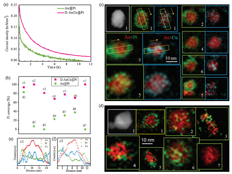 | Fig. 4. Electrocatalytic stability and structural changes of the D-AuCu@Pt and the Au@Pt catalyst. (a) Long-term stability test by holding at 0.6 V for 12 h. (b) Statistical analysis of the Pt coverage in different D-AuCu NPs (particles c1-c7 in (c)) and the Au NPs (particle d1-d7 in (d)) after stability test based on the EDX mapping shown in (c) and (d), respectively (c and d) EDX elemental mapping of the D-AuCu@Pt and Au@Pt catalyst after the stability test. (e and f) EDX line profiles along the directions as shown in the elemental mapping of particle 1 and 3 in (c), respectively. | |