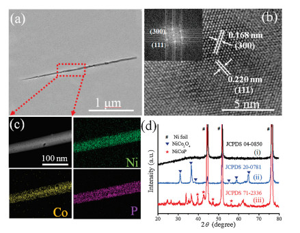 NiCoP active materials also display clear 1D thorn-like structural features in the TEM images (Fig. 2a). A well-resolved fringe is observed in the high-resolution TEM (HRTEM) (Fig. 2b). The core has clear lattice fringes with inter-planar spacing of 0.220 nm and 0.168 nm, corresponding to the (111) plane and (300) plane of NiCoP, respectively [33]. The corresponding fast Fourier transform (FFT) images (inset) recorded for NiCoP show the hexagonal structure of the single crystal, which confirms the homogeneous distribution of the three elements. The energy dispersive X-ray spectroscopy (EDS) elemental mapping images (Fig. 2c) further reflect the homogeneous distribution of the Ni, Co and P elements, indicating a uniform transformation of the Ni-Co precursor into NiCoP nanothorns. X-ray diffraction (XRD) pattern results (Fig. 2d) suggest that the NiCo precursor is successfully converted into hexagonal NiCoP through the phosphorization reaction. The most obvious peaks at 44.4°, 51.7° and 76.4° from the Ni substrate (JCPDS No. 04-0850), and all the other peaks could be found from NiCoP (JCPDS No. 71-2336) and NiCo2O4 (JCPDS card No. 20-0781), respectively.
