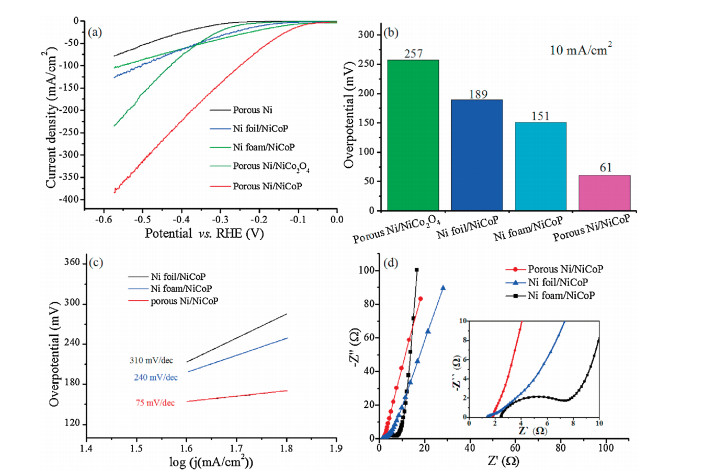 | Fig. 4. HER electrocatalysis in 1 mol/L KOH. (a) The porous Ni/NiCoP recorded at a scan rate of 5 mV/s, along with porous Ni, Ni foam/NiCoP, Ni foil/NiCoP and porous Ni/ NiCo2O4 for comparison. (b) Polarization curves-derived Tafel slopes. (c) Overpotential at 10 mA/cm2 of various as-prepared samples. (d) The comparative Nyquist plots of electrochemical impedance spectra. The inset enlarged plots. | |