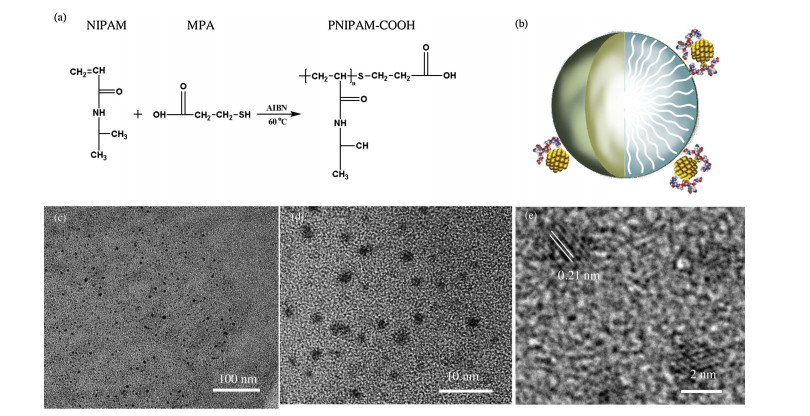 PNIPAM nanospheres afford efficient loading and controlled release of anticancer drugs. In this case, PNIPAM—COOH (Fig. 2a), a temperature-responsive polymer with a carboxylic acid-ended group, was prepared by free radical polymerization between NIPAM monomers and β-mercaptopropionic acid (MPA) by using azobisisobutyronitrile (AIBN) as the initiator [29, 30]. Representa-tive TEM images of the formed PNIPAM—COOH nanospheres are shown in Fig. S2 (Supporting information). Their diameters ranged from 120 nm to 300 nm, which is a suitable size for drug nanocarriers.