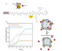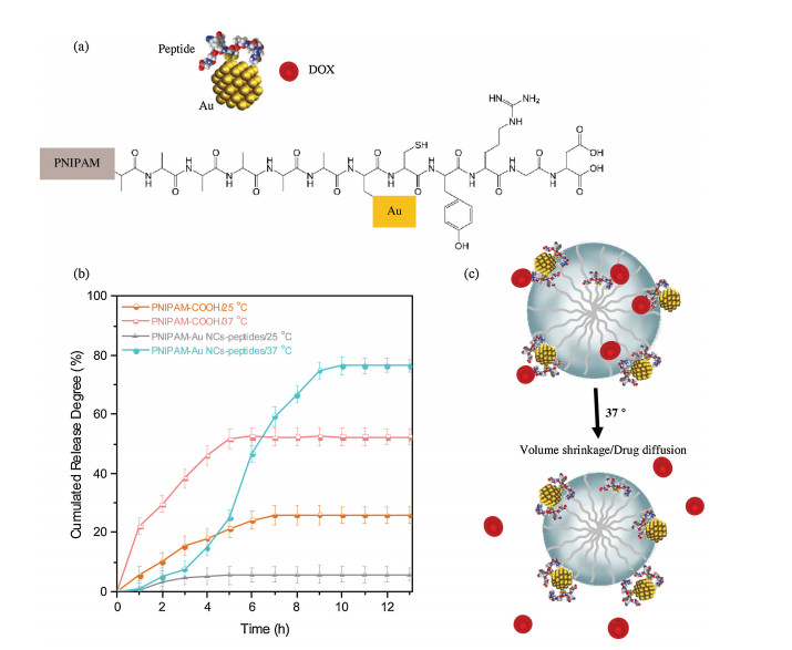 | Fig. 3. (a) Synthetic route of PNIPAM-Au-peptide nanospheres and its interaction with DOX. (b) The drug release kinetics of DOX from PNIPAM COOH and PNIPAM-Au-peptide nanospheres at 37 ℃ and 25 ℃. (c) Schematically drawing of the proposed release mechanisms. | |