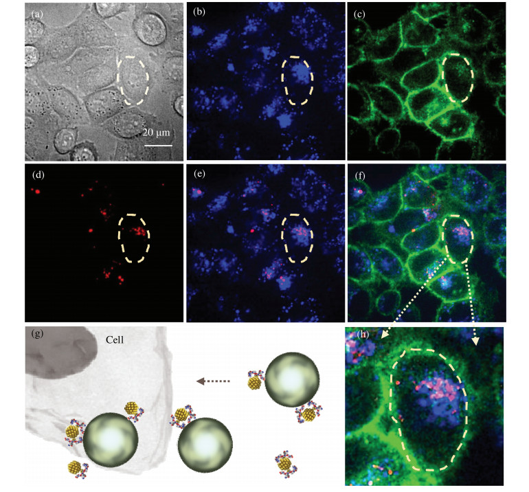 | Fig. 4. (a–f) Spinning disk confocal fluorescence images of cultured HeLa cells in DMEM after incubation with PNIPAM-Au-peptide nanospheres for 2 h (gray, bright field; red, PNIPAM-Au-peptide; blue, lysosomal marker; purple, colocalization of red and blue; green, membrane). (g) Schematically drawing of proposed model for nanosphere-cell interactions. (h) The magnified image of nanoclusters-loaded cell from (f). | |