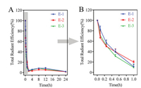 | Fig. 3. Kinetic profiles (n = 3) of nanoemulsion in three groups by quantifying total radiant efficiency (TRE) of different time point blood samples after i.v. administra-tion of PNEs in rats (A); enlargement of the kinetic profiles of nanoemulsion within 0–1 h (B). | |