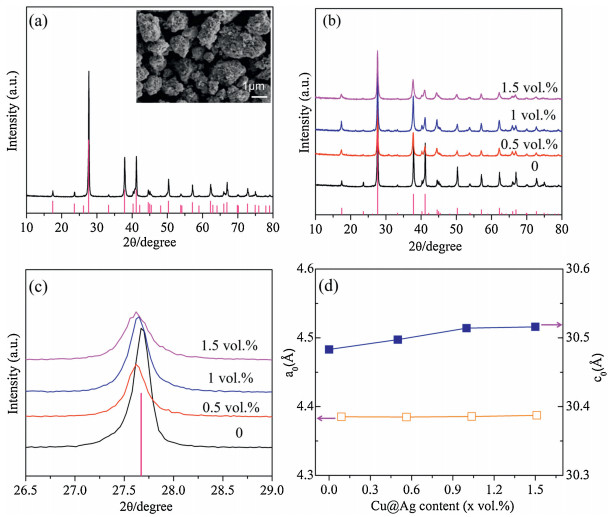 | Fig. 2. (a) Powder XRD patterns of Bi2Te3 powder with the inset of FE-SEM image of the pure Bi2Te3 powders. (b) XRD patterns of Bi2Te3 bulk containing x vol% Cu@Ag nanoparticles (x = 0, 0.5, 1.0, 1.5). (c) Expanded view of XRD patterns for angles between 26.5° and 29°. (d) Lattice parameters along a- and c-direction in composites. | |