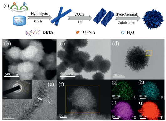 HRTEM image was further used to determine the internal structure of CT-500 (Fig. 1e). The distinct interplanar spacing is about 0.35 nm, which is indexed to the (101) crystal plane of anatase phase, indicating the formation of TiO2. STEM image and the elemental mapping (Figs. 1f-j) illustrate that CT-500 is composed of Ti, O, C and N elements, showing a homogeneous distribution across the sample. It should be noted that C and N elements mainly derive from isopropanol, ethylene glycol and DETA, respectively. Their existence will make for the enhancement of the conductivity and increase of surface defects.