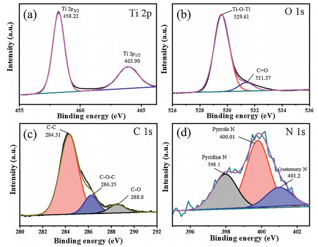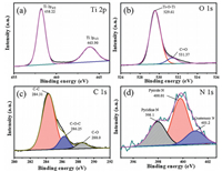 | Fig. 3. High-resolution XPS spectra of CT-500: (a) Ti 2p, (b) O 1s, (c) C 1s and (d) N 1s. | |