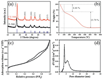 | Fig. 2. (a) XRD patterns of CT-500 and T-500 products, (b) TGA curve, (c) N2 adsorption-desorption isotherm, and (d) corresponding pore size distribution plot of CT-500. | |