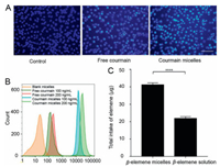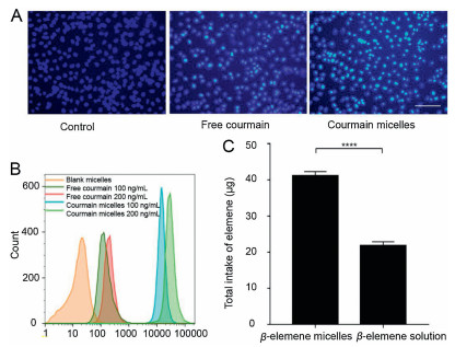 | Fig. 3. Cell uptake of different formulations. (A) Fluorescent images of C26 cells treated with medium, free coumarin, and coumarin micelles under a confocal microscope at the indicated time intervals (Scale bar: 5 nm). (B) Flow cytometric histograms for the blank micelles, free coumarin and coumarin micelles in C26 cells. (C) The total intake of β-elemene in C26 cells detected by the HPLC. | |