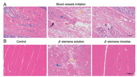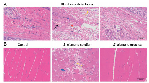 The irritation through intravenous injection was assessed by H & E staining (Fig. 5A). The tissue necrosis (blue arrow), bleeding (black arrow), blood clot (red arrow) and inflammatory cells (yellow arrow) were observed at the injection sites of β-elemene solution group, while above phenomena were not observed in the normal saline or β-elemene micelle groups. Therefore, β-elemene micelles reduced the irritation of β-elemene to injection sites. The irritation of β-elemene through intramuscular injection was also studied (Fig. 5B). As same as the normal saline group, muscle fiber was closely aligned around the injection sites after intramuscular injection of β-elemene micelles. However, severe irritation was observed in the free β-elemene group, such as muscle cell necrosis (blue arrow) and inflammatory cell infiltration (yellow arrow). These results further indicated that β-elemene micelles produced less irritation to mice than free β-elemene.