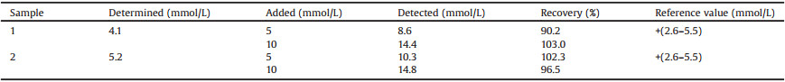 To evaluate its viability for the analysis of glucose, the assay was applied to the determination of human urine collected from hospital of integrated Traditional and Western Medicine in Qingdao city. As shown in Table 1, the contents of glucose in these two samples are 4.1 and 5.2 mmol/L, which are similar to the reference value given by the hospital (2.6–5.5 mmol/L). Recovery tests were conducted to evaluate the reliability of the method. As summarized in Table 1, recoveries ranged from 90.2% to 103.0% and 96.5% to 102.3% in sample 1 and sample 2, respectively, indicating the proposed method is reliable and suitable for practical applications.