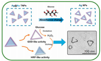 Based on these considerations, we deposit a thin layer of Au shells on the Ag TNPs by an epitaxial growth method to construct Ag@Au core/shell TNPs [28]. The introduction of Au shell not only enhances the stability of Ag TNPs, but also endows the material with GOD- and HRP-like dual nanozymes properties. In addition, the Ag TNPs can be used as signal transducers for visual readout. These two features make the Ag@Au core/shell TNPs viable candidates as nanoprobes for the colorimetric detection of glucose. Compared with the previous nanozymes-based glucose sensors, our method avoids the use of enzymes and organic chromogenic agent. The colorimetric assay developed was successfully applied to the determination of glucose in human urine, showing its great potential for on-site monitoring of glucose.