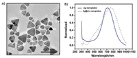 | Fig. 2. Ag TNPs characterization: (a) TEM of the Ag TNPs; (b) UV–vis absorption spectra of Ag TNPs (blue curve) and Ag@Au TNPs (blue dotted curve). | |