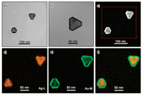 | Fig. 3. (a, b) a HRTEM image, (c) corresponding HAADF-STEM image and (d, f) EDX elemental maps of synthetic Ag@Au triangle nanoplates. | |