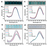 | Fig. 5. UV–vis absorption images of Ag@Au TNPs with different gold-shell thicknesses to detect glucose: (b) 400 μL HAuCl4; (d) 200 μL HAuCl4; (f) 100 μL HAuCl4; (h) 30 μL HAuCl4; and (a, c, e, g) their corresponding digital photographs. | |