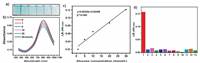 | Fig. 6. (a) Photographs and (b) corresponding UV–vis absorption spectra of Ag@Au TNPs with different concentrations of glucose under optimized conditions. (c) Relationship between the absorption peak decline of test solution and glucose concentration. (d) The response of the colorimetric assay towards: 1. glucose (5 mmol/L); 2. carbamide (50 mmol/L); 3. NH4+ (50 mmol/L); 4. S2O32- (50 mmol/L); 5. glycine (50 mmol/L); 6. histidine (50 mmol/L); 7. Ca2+ (70 mmol/L); 8. Mg2+ (70 mmol/L); 9. K+ (70 mmol/L); 10. Na+ (70 mmol/L); 11. S2- (50 mmol/L); 12. SO32- (50 mmol/L); 13. NO3- (50 mmol/L). | |