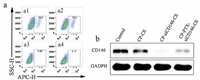 | Fig. 6. (a) Expression of CD146 in MDA-MB-231 cells after the treatment of control (a1), CP-CS (a2), CP-siCD146-CS (a3) and CP-PTX-siCD146-CS (a4) determined by immunophenotyping. (b) CD146 protein expression after the treatment of control, CP-CS, CP-siCD146-CS and CP-PTX-siCD146-CS in MDA-MB-231 cells by western blot. | |