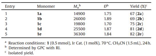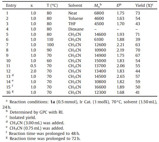 (4-(3-(Dimethylsilyl)propoxy)-phenyl)methanol (1a) was cho-sen as the model monomer to conduct the condition optimization.The results were depicted in Table 1. According to the conditions in our previous work [23], the reaction was performed under neat condition at 80 C. However, only middle-Mn polymer was obtained (entry 1). In order to improve the Mn and Ð of the product, the effects of solvent were conducted. Use tetrahydrofu-ran (THF) or toluene as solvent led to low-Mn polymers (entries 2 and 3). Reactions carried out in 1, 4-dioxane resulted in no product, suggesting that the coordination ability of cyclic ethers might be the main reason for the low-Mn observed with THF (entries 3 and 4). Then, acetonitrile (CH3CN) was used as solvent; a high-molecular-weight polymer with Mn of 14600 was obtained (entry 5). Afterwards, the effects of reaction temperature were performed carefully. Rising temperature led to polymers with lower Mn and broader Ð (entries 6–8). However, lowering the temperature to 60 ℃ resulted in apparent decrease of yield with slightly rising of Mn (entry 10). When reaction temperature was lowered to 70 ℃, a high molecular weight polymer with narrow Ð was obtained albeit with slightly lower yield (entry 9).